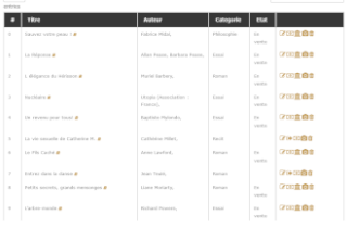 Présentation en mode "tableur", tri et recherche par auteur, titre, mots clés, ..., fonctionnalités : editer la quatrième de couverture (lodiciquarte), liker, saisie de la fiche de prêt, changer le visuel de couverture, mettre en vente ou retirer de la bibliothèque.