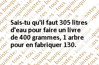 Chaque bouquiniste est ECO-RESPONSABLE. Symboliquement et comme témoins de nos efforts, à chaque prêt, vente ou don, notre compteur de mesure d'économie d'eau augmentera de 305 l () et tous les 130 prêts ou ventes, notre compteur d'économie d'arbre augmentera de 1 ().